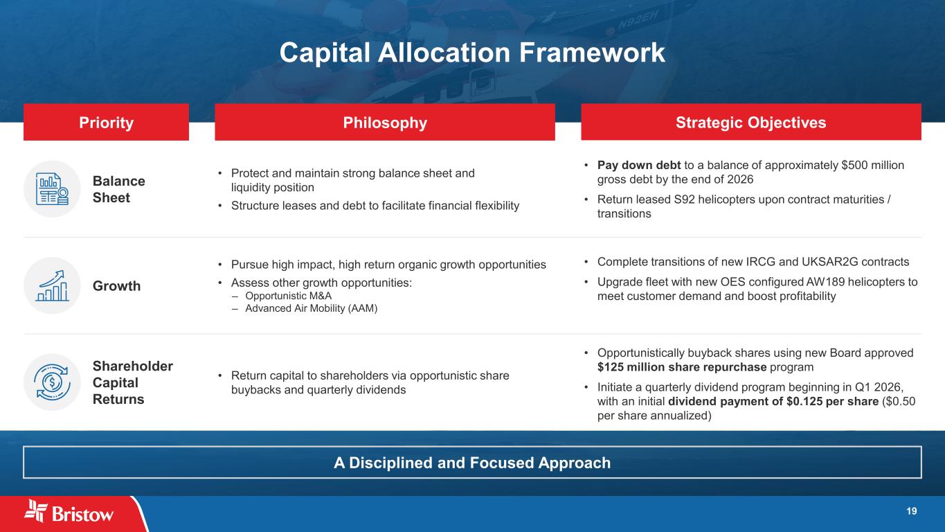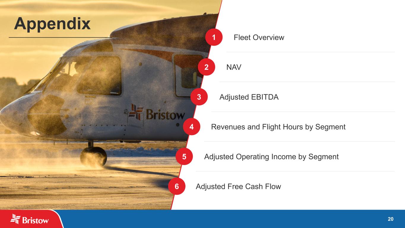19 Priority Philosophy Strategic Objectives Capital Allocation Framework Balance Sheet Growth Shareholder Capital Returns • Protect and maintain strong balance sheet and liquidity position • Structure leases and debt to facilitate financial flexibility • Pursue high impact, high return organic growth opportunities • Assess other growth opportunities: ─ Opportunistic M&A ─ Advanced Air Mobility (AAM) • Return capital to shareholders via opportunistic share buybacks and quarterly dividends • Pay down debt to a balance of approximately $500 million gross debt by the end of 2026 • Return leased S92 helicopters upon contract maturities / transitions • Complete transitions of new IRCG and UKSAR2G contracts • Upgrade fleet with new OES configured AW189 helicopters to meet customer demand and boost profitability • Opportunistically buyback shares using new Board approved $125 million share repurchase program • Initiate a quarterly dividend program beginning in Q1 2026, with an initial dividend payment of $0.125 per share ($0.50 per share annualized) A Disciplined and Focused Approach
