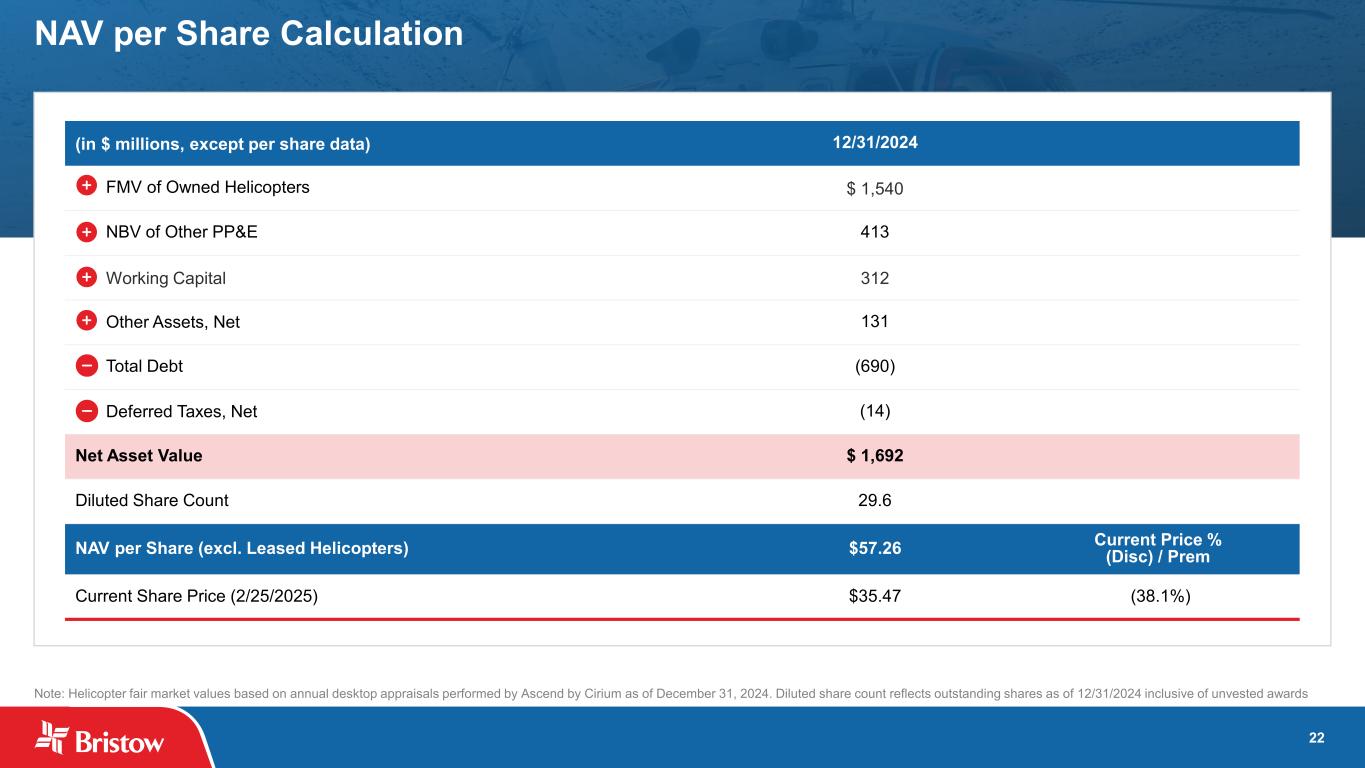 21 Fleet Overview 1. As of 12/31/2024. Does not include certain aircraft shown in the “under construction” line in the fleet table. Upon completion of additional configuration, the newly delivered aircraft will appear in the fleet table above when put into service. 2. Reflects the average age of helicopters that are owned by the Company. 3. Under construction reflects new aircraft that the Company has either taken ownership of and are undergoing additional configuration before being placed into service or are currently under construction by the Original Equipment Manufacturer (“OEM”) and pending delivery. Includes eight AW189 heavy helicopters (of which two were delivered and are undergoing additional configuration), six AW139 medium helicopters (of which four were delivered and undergoing additional configuration) and four H135 light-twin helicopters. 4. On order reflects aircraft that the Company has commitments to purchase but construction has not yet begun. Includes two AW189 heavy helicopters and five AW169 light-twin helicopters. 5. Options include ten AW189 heavy helicopters and ten H135 light-twin helicopters. NUMBER OF AIRCRAFT(1) TYPE OWNED AIRCRAFT LEASED AIRCRAFT TOTAL AIRCRAFT AVERAGE AGE (YEARS)(2) Heavy Helicopters: S92 34 29 63 15 AW189 19 4 23 8 53 33 86 Medium Helicopters: AW139 48 4 52 14 S76 D/C++ 14 — 14 13 AS365 1 — 1 35 63 4 67 Light—Twin Engine Helicopters: AW109 3 — 3 17 EC135 / H135 10 1 11 15 13 1 14 Light—Single Engine Helicopters: AS350 12 — 12 25 AW119 13 — 13 18 25 — 25 Total Helicopters 154 38 192 14 Fixed Wing 9 5 14 UAS 4 — 4 Total Fleet 167 43 210 HEAVY MEDIUM LIGHT TWIN TOTAL Under construction(3) 8 6 4 18 On order(4) 2 — 5 7 Options(5) 10 — 10 20