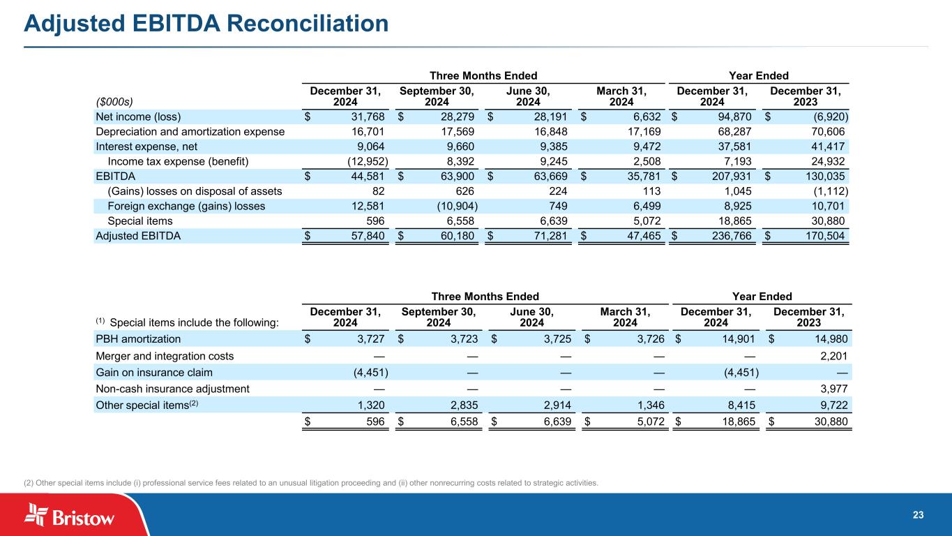 23 Adjusted EBITDA Reconciliation (2) Other special items include (i) professional service fees related to an unusual litigation proceeding and (ii) other nonrecurring costs related to strategic activities. Three Months Ended Year Ended (1) Special items include the following: December 31, 2024 September 30, 2024 June 30, 2024 March 31, 2024 December 31, 2024 December 31, 2023 PBH amortization $ 3,727 $ 3,723 $ 3,725 $ 3,726 $ 14,901 $ 14,980 Merger and integration costs — — — — — 2,201 Gain on insurance claim (4,451) — — — (4,451) — Non-cash insurance adjustment — — — — — 3,977 Other special items(2) 1,320 2,835 2,914 1,346 8,415 9,722 $ 596 $ 6,558 $ 6,639 $ 5,072 $ 18,865 $ 30,880 Three Months Ended Year Ended ($000s) December 31, 2024 September 30, 2024 June 30, 2024 March 31, 2024 December 31, 2024 December 31, 2023 Net income (loss) $ 31,768 $ 28,279 $ 28,191 $ 6,632 $ 94,870 $ (6,920) Depreciation and amortization expense 16,701 17,569 16,848 17,169 68,287 70,606 Interest expense, net 9,064 9,660 9,385 9,472 37,581 41,417 Income tax expense (benefit) (12,952) 8,392 9,245 2,508 7,193 24,932 EBITDA $ 44,581 $ 63,900 $ 63,669 $ 35,781 $ 207,931 $ 130,035 (Gains) losses on disposal of assets 82 626 224 113 1,045 (1,112) Foreign exchange (gains) losses 12,581 (10,904) 749 6,499 8,925 10,701 Special items 596 6,558 6,639 5,072 18,865 30,880 Adjusted EBITDA $ 57,840 $ 60,180 $ 71,281 $ 47,465 $ 236,766 $ 170,504