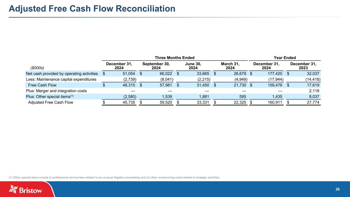 25 Adjusted Operating Income Reconciliation 2024 Government Services margins were adversely impacted by: i. Start-up costs for new Government Services contracts; ii. Supply chain challenges limiting aircraft availability iii. Adverse foreign exchange impacts; and Year Ended December 31, 2024 2023 2022 Offshore Energy Services: Operating income 132,165 45,613 11,500 Depreciation and amortization expense 28,404 30,783 33,353 PBH amortization 12,230 12,377 12,017 Offshore Energy Services Adjusted Operating Income $ 172,799 $ 88,773 $ 56,870 Government Services: Operating income $ 21,070 $ 29,610 $ 38,889 Depreciation and amortization expense 27,694 29,101 24,997 PBH amortization 2,002 1,940 864 Government Services Adjusted Operating Income $ 50,766 $ 60,651 $ 64,750 Other Services: Operating income $ 13,747 $ 15,398 $ 2,243 Depreciation and amortization expense 11,370 9,768 7,631 PBH amortization 669 663 410 Other Services Adjusted Operating Income $ 25,786 $ 25,829 $ 10,284 Total Segments Adjusted Operating Income $ 249,351 $ 175,253 $ 131,904 Corporate: Operating loss $ (34,374) $ (29,870) $ (26,633) Depreciation and amortization expense 819 954 525 Losses (gains) on disposal of assets 1,045 (1,112) 521 Corporate Adjusted Operating Loss $ (32,510) $ (30,028) $ (25,587) Consolidated Adjusted Operating Income $ 216,841 $ 145,225 $ 106,317