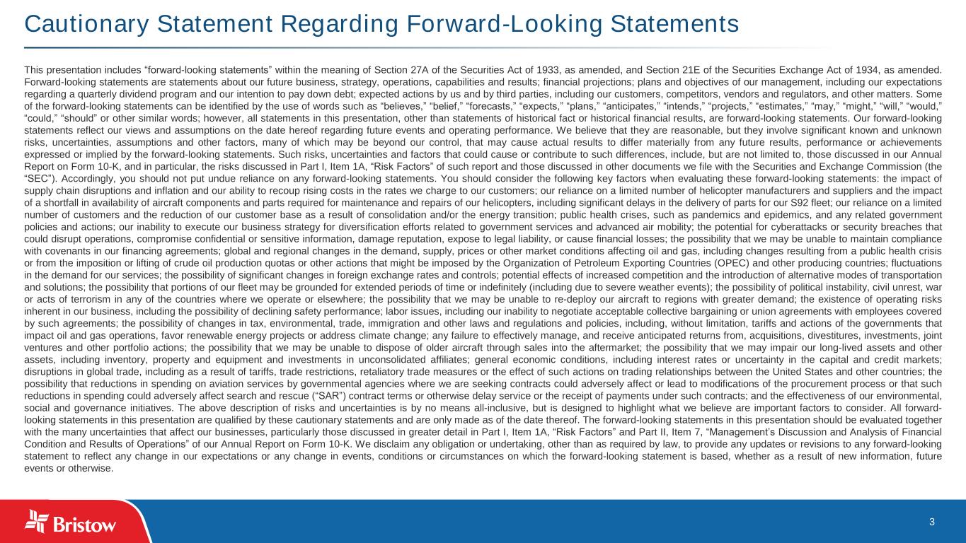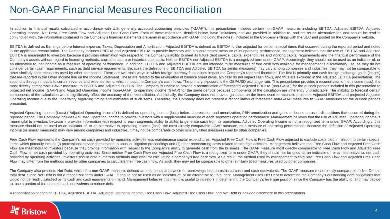 3 Cautionary Statement Regarding Forward-Looking Statements This presentation includes “forward-looking statements” within the meaning of Section 27A of the Securities Act of 1933, as amended, and Section 21E of the Securities Exchange Act of 1934, as amended. Forward-looking statements are statements about our future business, strategy, operations, capabilities and results; financial projections; plans and objectives of our management, including our expectations regarding a quarterly dividend program and our intention to pay down debt; expected actions by us and by third parties, including our customers, competitors, vendors and regulators, and other matters. Some of the forward-looking statements can be identified by the use of words such as “believes,” “belief,” “forecasts,” “expects,” “plans,” “anticipates,” “intends,” “projects,” “estimates,” “may,” “might,” “will,” “would,” “could,” “should” or other similar words; however, all statements in this presentation, other than statements of historical fact or historical financial results, are forward-looking statements. Our forward-looking statements reflect our views and assumptions on the date hereof regarding future events and operating performance. We believe that they are reasonable, but they involve significant known and unknown risks, uncertainties, assumptions and other factors, many of which may be beyond our control, that may cause actual results to differ materially from any future results, performance or achievements expressed or implied by the forward-looking statements. Such risks, uncertainties and factors that could cause or contribute to such differences, include, but are not limited to, those discussed in our Annual Report on Form 10-K, and in particular, the risks discussed in Part I, Item 1A, “Risk Factors” of such report and those discussed in other documents we file with the Securities and Exchange Commission (the “SEC”). Accordingly, you should not put undue reliance on any forward-looking statements. You should consider the following key factors when evaluating these forward-looking statements: the impact of supply chain disruptions and inflation and our ability to recoup rising costs in the rates we charge to our customers; our reliance on a limited number of helicopter manufacturers and suppliers and the impact of a shortfall in availability of aircraft components and parts required for maintenance and repairs of our helicopters, including significant delays in the delivery of parts for our S92 fleet; our reliance on a limited number of customers and the reduction of our customer base as a result of consolidation and/or the energy transition; public health crises, such as pandemics and epidemics, and any related government policies and actions; our inability to execute our business strategy for diversification efforts related to government services and advanced air mobility; the potential for cyberattacks or security breaches that could disrupt operations, compromise confidential or sensitive information, damage reputation, expose to legal liability, or cause financial losses; the possibility that we may be unable to maintain compliance with covenants in our financing agreements; global and regional changes in the demand, supply, prices or other market conditions affecting oil and gas, including changes resulting from a public health crisis or from the imposition or lifting of crude oil production quotas or other actions that might be imposed by the Organization of Petroleum Exporting Countries (OPEC) and other producing countries; fluctuations in the demand for our services; the possibility of significant changes in foreign exchange rates and controls; potential effects of increased competition and the introduction of alternative modes of transportation and solutions; the possibility that portions of our fleet may be grounded for extended periods of time or indefinitely (including due to severe weather events); the possibility of political instability, civil unrest, war or acts of terrorism in any of the countries where we operate or elsewhere; the possibility that we may be unable to re-deploy our aircraft to regions with greater demand; the existence of operating risks inherent in our business, including the possibility of declining safety performance; labor issues, including our inability to negotiate acceptable collective bargaining or union agreements with employees covered by such agreements; the possibility of changes in tax, environmental, trade, immigration and other laws and regulations and policies, including, without limitation, tariffs and actions of the governments that impact oil and gas operations, favor renewable energy projects or address climate change; any failure to effectively manage, and receive anticipated returns from, acquisitions, divestitures, investments, joint ventures and other portfolio actions; the possibility that we may be unable to dispose of older aircraft through sales into the aftermarket; the possibility that we may impair our long-lived assets and other assets, including inventory, property and equipment and investments in unconsolidated affiliates; general economic conditions, including interest rates or uncertainty in the capital and credit markets; disruptions in global trade, including as a result of tariffs, trade restrictions, retaliatory trade measures or the effect of such actions on trading relationships between the United States and other countries; the possibility that reductions in spending on aviation services by governmental agencies where we are seeking contracts could adversely affect or lead to modifications of the procurement process or that such reductions in spending could adversely affect search and rescue (“SAR”) contract terms or otherwise delay service or the receipt of payments under such contracts; and the effectiveness of our environmental, social and governance initiat