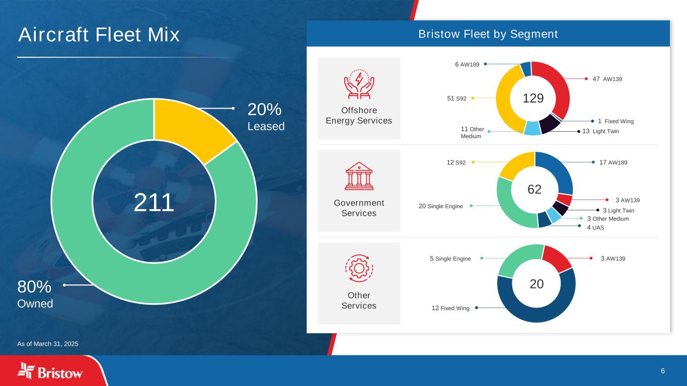 5 8% Light Twin 12% Single Engine 8% Fixed Wing / UAS 30% S92 11% AW189 25% AW139 6% Other Medium 211 Revenues by Segment(2)Aircraft Fleet(1) Revenues by Region(3) Leading Global Provider of Innovative and Sustainable Vertical Flight Solutions Presence on 6 Continents Customers in 18 Countries Publicly Traded on NYSE (VTOL) Global Employees 3,469 Total 906 Pilots 917 Engineers 68% Offshore Energy Services 8% Other Services 24% Government Services $1.4 bn 28% Americas 52% Europe 7% Asia Pacific 13% Africa $1.4 bn (1) As of 3/31/2025; see slide 20 for further details (2) Reflects LTM revenues by segment as of 3/31/2025; see slide 22 for additional details (3) Reflects LTM revenues by region as of 3/31/2025