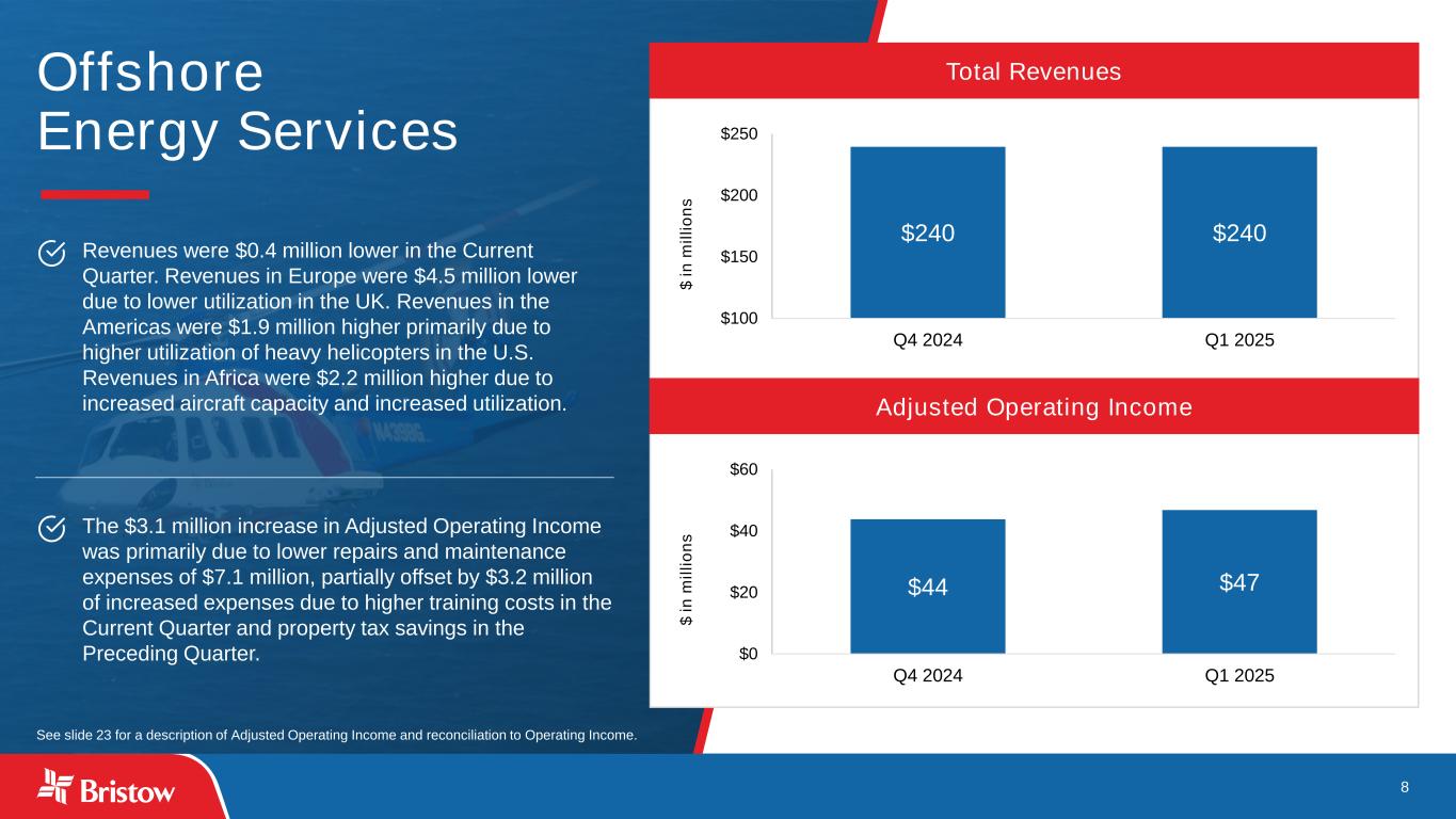 7 Q1 2025 Consolidated Financial Results (1) “Current Quarter” refers to the three months ended March 31, 2025, and “Preceding Quarter” refers to the three months ended December 31, 2024. (2) See slide 21 for a description of Adjusted EBITDA and reconciliation to net income. Revenues were $3.0 million lower in the Current Quarter(1) primarily due to lower utilization resulting from seasonality in Other Services, partially offset by higher revenues from new contracts in Government Services. Offshore Energy Services (“OES”) revenues were consistent with the Preceding Quarter. Adjusted EBITDA(2) was consistent with the Preceding Quarter(1). Lower revenues were offset by lower operating and general and administrative expenses. Total Revenues Adjusted EBITDA(2) $354 $351 $100 $160 $220 $280 $340 $400 Q4 2024 Q1 2025 $ i n m ill io n s $58 $58 $0 $25 $50 $75 Q4 2024 Q1 2025 $ i n m ill io n s