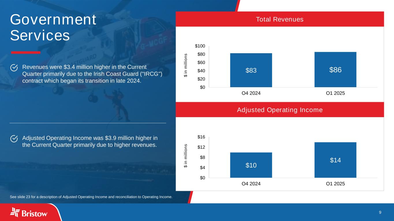 8 Offshore Energy Services Total Revenues Adjusted Operating Income Revenues were $0.4 million lower in the Current Quarter. Revenues in Europe were $4.5 million lower due to lower utilization in the UK. Revenues in the Americas were $1.9 million higher primarily due to higher utilization of heavy helicopters in the U.S. Revenues in Africa were $2.2 million higher due to increased aircraft capacity and increased utilization. The $3.1 million increase in Adjusted Operating Income was primarily due to lower repairs and maintenance expenses of $7.1 million, partially offset by $3.2 million of increased expenses due to higher training costs in the Current Quarter and property tax savings in the Preceding Quarter. $44 $47 $0 $20 $40 $60 Q4 2024 Q1 2025 $ i n m il li o n s $240 $240 $100 $150 $200 $250 Q4 2024 Q1 2025 $ i n m il li o n s See slide 23 for a description of Adjusted Operating Income and reconciliation to Operating Income.