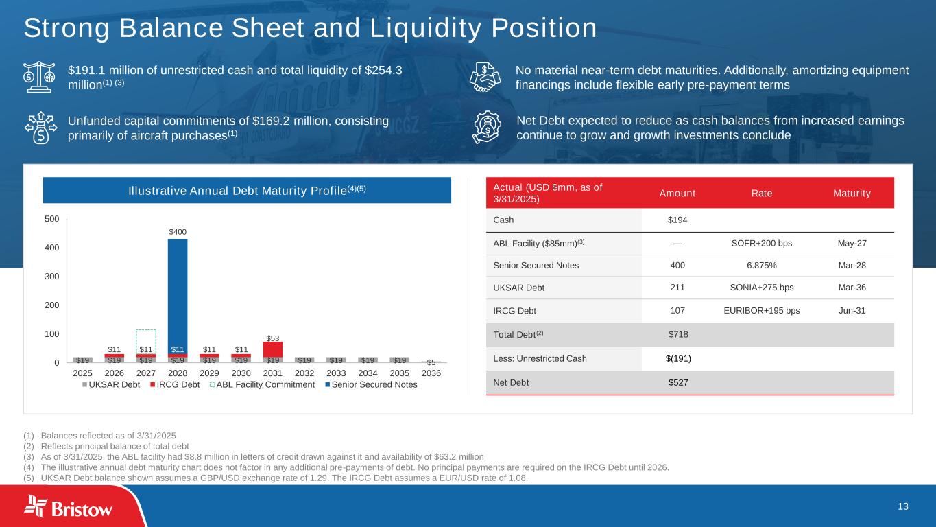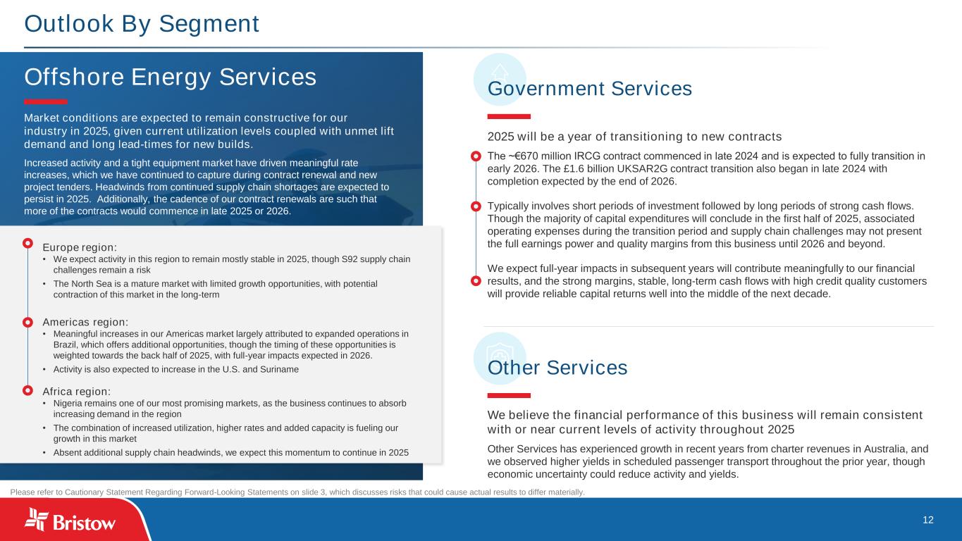 12 Outlook By Segment Please refer to Cautionary Statement Regarding Forward-Looking Statements on slide 3, which discusses risks that could cause actual results to differ materially. Offshore Energy Services Market conditions are expected to remain constructive for our industry in 2025, given current utilization levels coupled with unmet lift demand and long lead-times for new builds. Increased activity and a tight equipment market have driven meaningful rate increases, which we have continued to capture during contract renewal and new project tenders. Headwinds from continued supply chain shortages are expected to persist in 2025. Additionally, the cadence of our contract renewals are such that more of the contracts would commence in late 2025 or 2026. Europe region: • We expect activity in this region to remain mostly stable in 2025, though S92 supply chain challenges remain a risk • The North Sea is a mature market with limited growth opportunities, with potential contraction of this market in the long-term Americas region: • Meaningful increases in our Americas market largely attributed to expanded operations in Brazil, which offers additional opportunities, though the timing of these opportunities is weighted towards the back half of 2025, with full-year impacts expected in 2026. • Activity is also expected to increase in the U.S. and Suriname Africa region: • Nigeria remains one of our most promising markets, as the business continues to absorb increasing demand in the region • The combination of increased utilization, higher rates and added capacity is fueling our growth in this market • Absent additional supply chain headwinds, we expect this momentum to continue in 2025 2025 will be a year of transitioning to new contracts The ~€670 million IRCG contract commenced in late 2024 and is expected to fully transition in early 2026. The £1.6 billion UKSAR2G contract transition also began in late 2024 with completion expected by the end of 2026. Typically involves short periods of investment followed by long periods of strong cash flows. Though the majority of capital expenditures will conclude in the first half of 2025, associated operating expenses during the transition period and supply chain challenges may not present the full earnings power and quality margins from this business until 2026 and beyond. We expect full-year impacts in subsequent years will contribute meaningfully to our financial results, and the strong margins, stable, long-term cash flows with high credit quality customers will provide reliable capital returns well into the middle of the next decade. Government Services We believe the financial performance of this business will remain consistent with or near current levels of activity throughout 2025 Other Services has experienced growth in recent years from charter revenues in Australia, and we observed higher yields in scheduled passenger transport throughout the prior year, though economic uncertainty could reduce activity and yields. Other Services