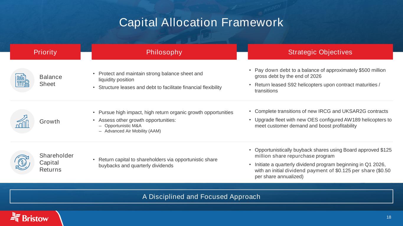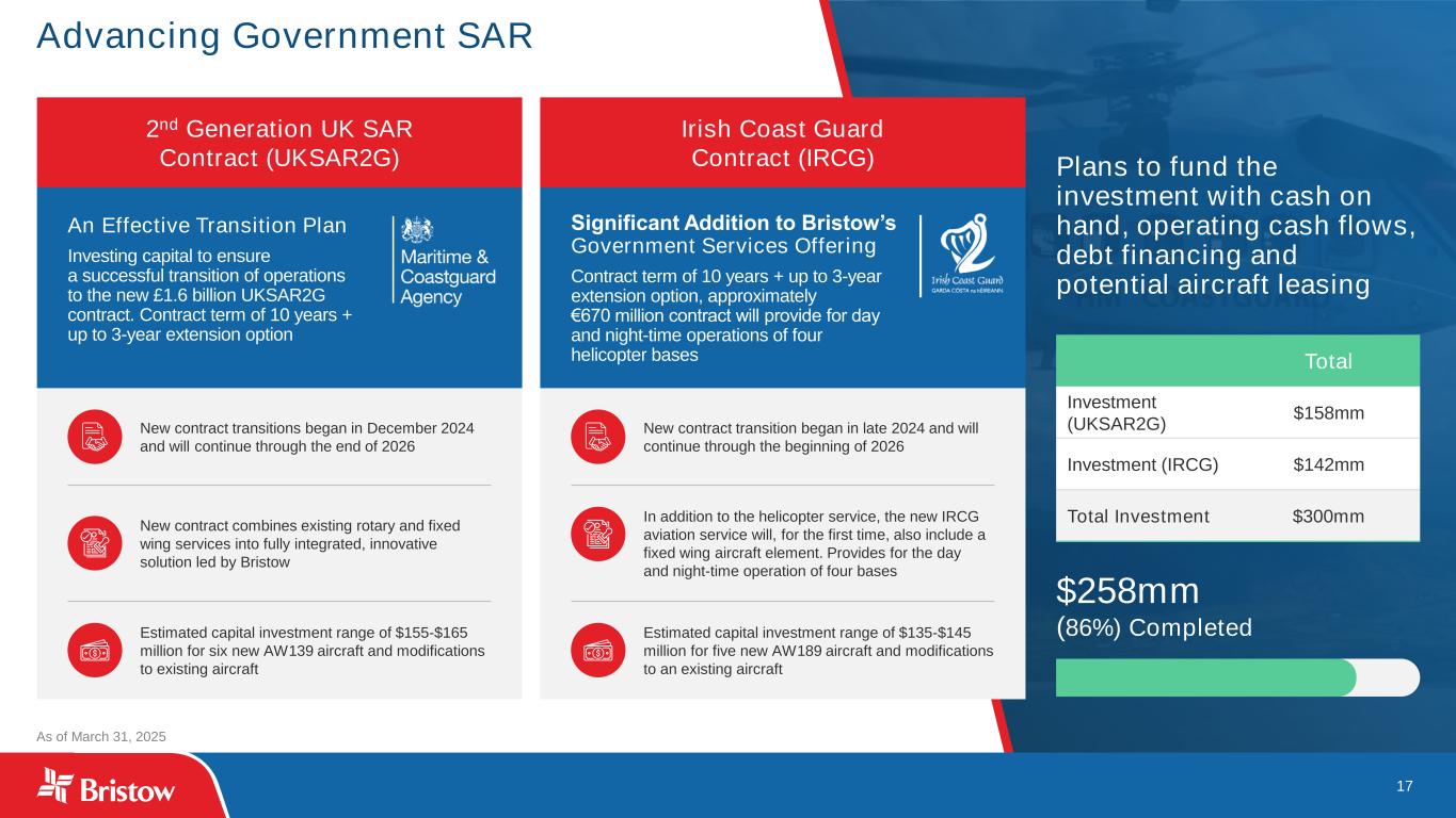 Advancing Government SAR As of March 31, 2025 An Effective Transition Plan Investing capital to ensure a successful transition of operations to the new £1.6 billion UKSAR2G contract. Contract term of 10 years + up to 3-year extension option 2nd Generation UK SAR Contract (UKSAR2G) Total Investment (UKSAR2G) $158mm Investment (IRCG) $142mm Total Investment $300mm Plans to fund the investment with cash on hand, operating cash flows, debt financing and potential aircraft leasing New contract transitions began in December 2024 and will continue through the end of 2026 Estimated capital investment range of $155-$165 million for six new AW139 aircraft and modifications to existing aircraft New contract combines existing rotary and fixed wing services into fully integrated, innovative solution led by Bristow Irish Coast Guard Contract (IRCG) Significant Addition to Bristow’s Government Services Offering Contract term of 10 years + up to 3-year extension option, approximately €670 million contract will provide for day and night-time operations of four helicopter bases New contract transition began in late 2024 and will continue through the beginning of 2026 Estimated capital investment range of $135-$145 million for five new AW189 aircraft and modifications to an existing aircraft In addition to the helicopter service, the new IRCG aviation service will, for the first time, also include a fixed wing aircraft element. Provides for the day and night-time operation of four bases $258mm (86%) Completed 17