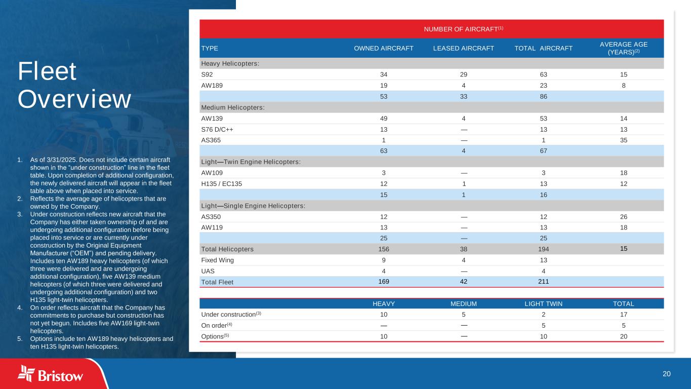 20 Fleet Overview NUMBER OF AIRCRAFT(1) TYPE OWNED AIRCRAFT LEASED AIRCRAFT TOTAL AIRCRAFT AVERAGE AGE (YEARS)(2) Heavy Helicopters: S92 34 29 63 15 AW189 19 4 23 8 53 33 86 Medium Helicopters: AW139 49 4 53 14 S76 D/C++ 13 — 13 13 AS365 1 — 1 35 63 4 67 Light—Twin Engine Helicopters: AW109 3 — 3 18 H135 / EC135 12 1 13 12 15 1 16 Light—Single Engine Helicopters: AS350 12 — 12 26 AW119 13 — 13 18 25 — 25 Total Helicopters 156 38 194 15 Fixed Wing 9 4 13 UAS 4 — 4 Total Fleet 169 42 211 HEAVY MEDIUM LIGHT TWIN TOTAL Under construction(3) 10 5 2 17 On order(4) — — 5 5 Options(5) 10 — 10 20 1. As of 3/31/2025. Does not include certain aircraft shown in the “under construction” line in the fleet table. Upon completion of additional configuration, the newly delivered aircraft will appear in the fleet table above when placed into service. 2. Reflects the average age of helicopters that are owned by the Company. 3. Under construction reflects new aircraft that the Company has either taken ownership of and are undergoing additional configuration before being placed into service or are currently under construction by the Original Equipment Manufacturer (“OEM”) and pending delivery. Includes ten AW189 heavy helicopters (of which three were delivered and are undergoing additional configuration), five AW139 medium helicopters (of which three were delivered and undergoing additional configuration) and two H135 light-twin helicopters. 4. On order reflects aircraft that the Company has commitments to purchase but construction has not yet begun. Includes five AW169 light-twin helicopters. 5. Options include ten AW189 heavy helicopters and ten H135 light-twin helicopters.