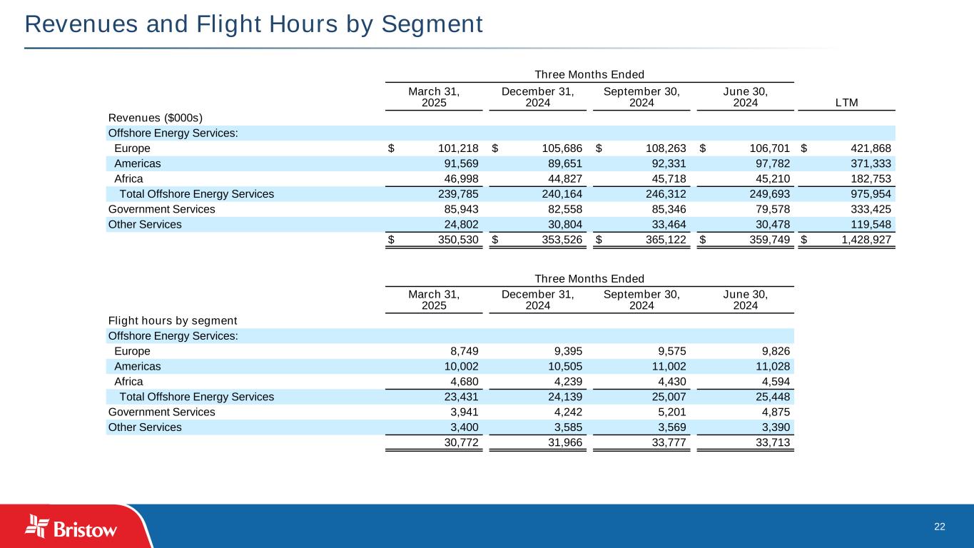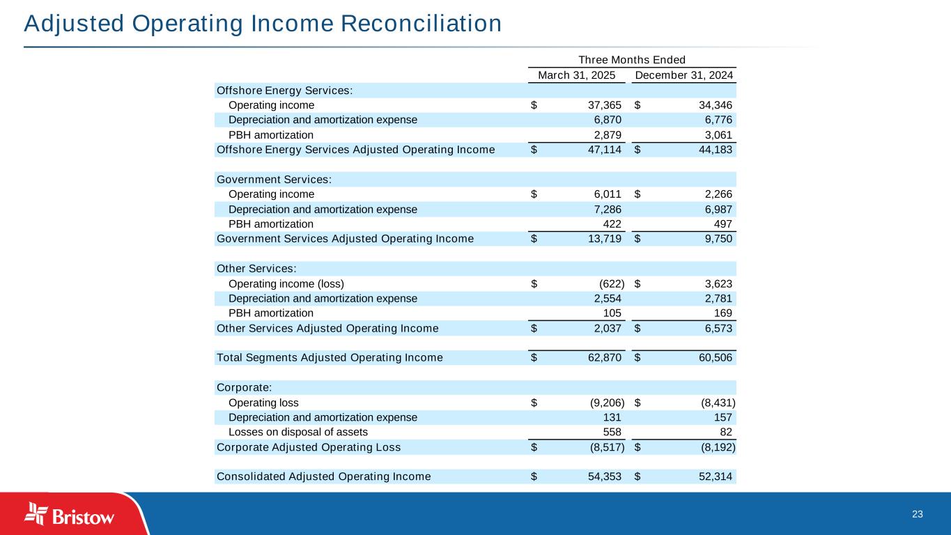22 Revenues and Flight Hours by Segment Three Months Ended March 31, 2025 December 31, 2024 September 30, 2024 June 30, 2024 LTM Revenues ($000s) Offshore Energy Services: Europe $ 101,218 $ 105,686 $ 108,263 $ 106,701 $ 421,868 Americas 91,569 89,651 92,331 97,782 371,333 Africa 46,998 44,827 45,718 45,210 182,753 Total Offshore Energy Services 239,785 240,164 246,312 249,693 975,954 Government Services 85,943 82,558 85,346 79,578 333,425 Other Services 24,802 30,804 33,464 30,478 119,548 $ 350,530 $ 353,526 $ 365,122 $ 359,749 $ 1,428,927 Three Months Ended March 31, 2025 December 31, 2024 September 30, 2024 June 30, 2024 Flight hours by segment Offshore Energy Services: Europe 8,749 9,395 9,575 9,826 Americas 10,002 10,505 11,002 11,028 Africa 4,680 4,239 4,430 4,594 Total Offshore Energy Services 23,431 24,139 25,007 25,448 Government Services 3,941 4,242 5,201 4,875 Other Services 3,400 3,585 3,569 3,390 30,772 31,966 33,777 33,713