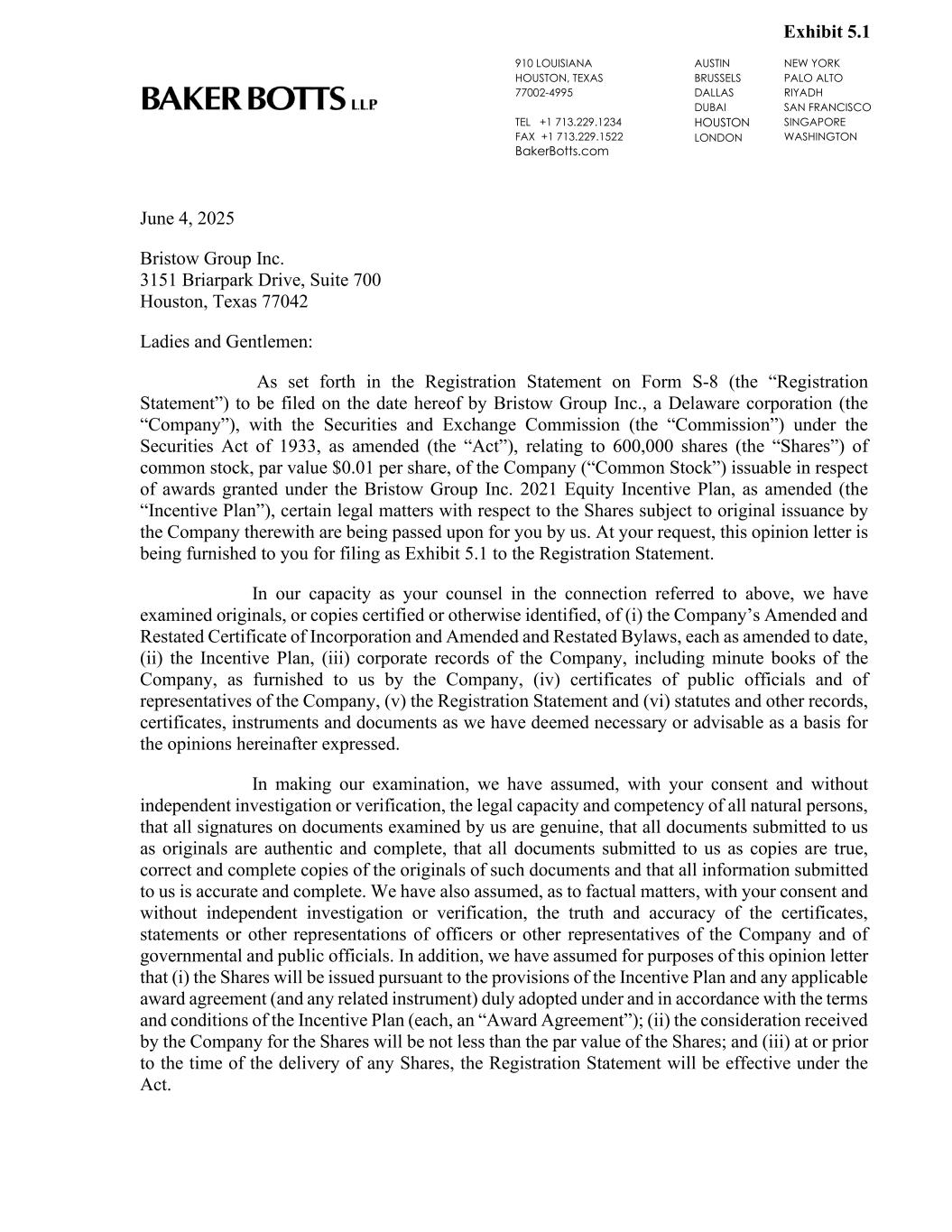 NEW YORK PALO ALTO RIYADH SAN FRANCISCO SINGAPORE WASHINGTON AUSTIN BRUSSELS DALLAS DUBAI HOUSTON LONDON 910 LOUISIANA HOUSTON, TEXAS 77002-4995 TEL +1 713.229.1234 FAX +1 713.229.1522 BakerBotts.com Exhibit 5.1 June 4, 2025 Bristow Group Inc. 3151 Briarpark Drive, Suite 700 Houston, Texas 77042 Ladies and Gentlemen: As set forth in the Registration Statement on Form S-8 (the “Registration Statement”) to be filed on the date hereof by Bristow Group Inc., a Delaware corporation (the “Company”), with the Securities and Exchange Commission (the “Commission”) under the Securities Act of 1933, as amended (the “Act”), relating to 600,000 shares (the “Shares”) of common stock, par value $0.01 per share, of the Company (“Common Stock”) issuable in respect of awards granted under the Bristow Group Inc. 2021 Equity Incentive Plan, as amended (the “Incentive Plan”), certain legal matters with respect to the Shares subject to original issuance by the Company therewith are being passed upon for you by us. At your request, this opinion letter is being furnished to you for filing as Exhibit 5.1 to the Registration Statement. In our capacity as your counsel in the connection referred to above, we have examined originals, or copies certified or otherwise identified, of (i) the Company’s Amended and Restated Certificate of Incorporation and Amended and Restated Bylaws, each as amended to date, (ii) the Incentive Plan, (iii) corporate records of the Company, including minute books of the Company, as furnished to us by the Company, (iv) certificates of public officials and of representatives of the Company, (v) the Registration Statement and (vi) statutes and other records, certificates, instruments and documents as we have deemed necessary or advisable as a basis for the opinions hereinafter expressed. In making our examination, we have assumed, with your consent and without independent investigation or verification, the legal capacity and competency of all natural persons, that all signatures on documents examined by us are genuine, that all documents submitted to us as originals are authentic and complete, that all documents submitted to us as copies are true, correct and complete copies of the originals of such documents and that all information submitted to us is accurate and complete. We have also assumed, as to factual matters, with your consent and without independent investigation or verification, the truth and accuracy of the certificates, statements or other representations of officers or other representatives of the Company and of governmental and public officials. In addition, we have assumed for purposes of this opinion letter that (i) the Shares will be issued pursuant to the provisions of the Incentive Plan and any applicable award agreement (and any related instrument) duly adopted under and in accordance with the terms and conditions of the Incentive Plan (each, an “Award Agreement”); (ii) the consideration received by the Company for the Shares will be not less than the par value of the Shares; and (iii) at or prior to the time of the delivery of any Shares, the Registration Statement will be effective under the Act.