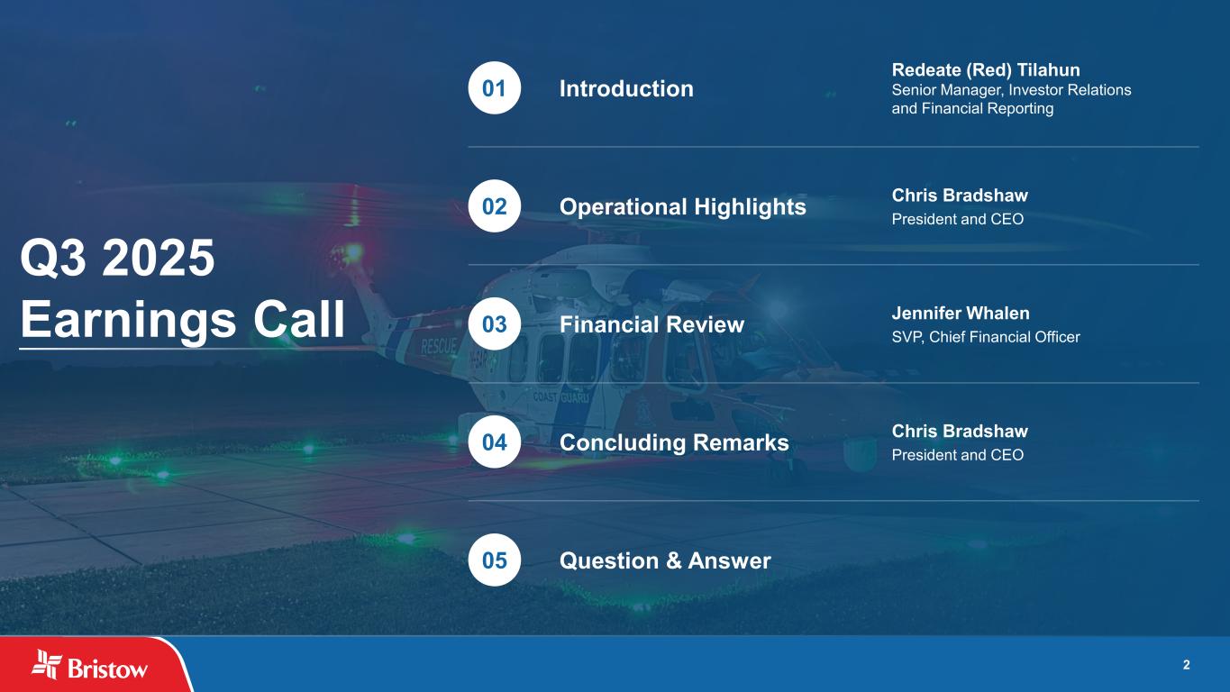 3 Cautionary Statement Regarding Forward-Looking Statements This presentation includes “forward-looking statements” within the meaning of Section 27A of the Securities Act of 1933, as amended, and Section 21E of the Securities Exchange Act of 1934, as amended. Forward-looking statements are statements about our future business, strategy, operations, capabilities and results; financial projections; plans and objectives of our management, including our expectations regarding a quarterly dividend program and our intention to pay down debt; expected actions by us and by third parties, including our customers, competitors, vendors and regulators, and other matters. Some of the forward-looking statements can be identified by the use of words such as “believes,” “belief,” “forecasts,” “expects,” “plans,” “anticipates,” “intends,” “projects,” “estimates,” “may,” “might,” “will,” “would,” “could,” “should” or other similar words; however, all statements in this presentation, other than statements of historical fact or historical financial results, are forward-looking statements. Our forward-looking statements reflect our views and assumptions on the date hereof regarding future events and operating performance. We believe that they are reasonable, but they involve significant known and unknown risks, uncertainties, assumptions and other factors, many of which may be beyond our control, that may cause actual results to differ materially from any future results, performance or achievements expressed or implied by the forward-looking statements. Such risks, uncertainties and factors that could cause or contribute to such differences, include, but are not limited to, those discussed in our Annual Report on Form 10-K, and in particular, the risks discussed in Part I, Item 1A, “Risk Factors” of such report and those discussed in other documents we file with the Securities and Exchange Commission (the “SEC”). Accordingly, you should not put undue reliance on any forward-looking statements. You should consider the following key factors when evaluating these forward-looking statements: the impact of supply chain disruptions and inflation and our ability to recoup rising costs in the rates we charge to our customers; our reliance on a limited number of helicopter manufacturers and suppliers and the impact of a shortfall in availability of aircraft components and parts required for maintenance and repairs of our helicopters, including significant delays in the delivery of parts for our S92 and AW189 fleet and aircraft in general; our reliance on a limited number of customers and the reduction of our customer base as a result of consolidation and/or the energy transition; public health crises, such as pandemics and epidemics, and any related government policies and actions; our inability to execute our business strategy for diversification efforts related to government services and advanced air mobility; the potential effects of the ongoing U.S. government shutdown on our Government Services business; the potential for cyberattacks or security breaches that could disrupt operations, compromise confidential or sensitive information, damage reputation, expose to legal liability, or cause financial losses; the possibility that we may be unable to maintain compliance with covenants in our financing agreements; global and regional changes in the demand, supply, prices or other market conditions affecting oil and gas, including changes resulting from a public health crisis or from the imposition or lifting of crude oil production quotas or other actions that might be imposed by the Organization of Petroleum Exporting Countries (OPEC) and other producing countries; fluctuations in the demand for our services; the possibility of significant changes in foreign exchange rates and controls; potential effects of increased competition and the introduction of alternative modes of transportation and solutions; the possibility that portions of our fleet may be grounded for extended periods of time or indefinitely (including due to severe weather events); the possibility of political instability, civil unrest, war or acts of terrorism in any of the countries where we operate or elsewhere; the possibility that we may be unable to re-deploy our aircraft to regions with greater demand; the existence of operating risks inherent in our business, including the possibility of declining safety performance; labor issues, including our inability to negotiate acceptable collective bargaining or union agreements with employees covered by such agreements; the possibility of changes in tax, environmental, trade, immigration and other laws and regulations and policies, including, without limitation, tariffs and actions of the governments that impact oil and gas operations, favor renewable energy projects or address climate change; any failure to effectively manage, and receive anticipated returns from, acquisitions, divestitures, investments, joint ventures and other portfolio actions; the possibility that we may be unable to dispose of older aircraft through sales into the aftermarket; the possibility that we may impair our long-lived assets and other assets, including inventory, property and equipment and investments in unconsolidated affiliates; general economic conditions, including interest rates or uncertainty in the capital and credit markets; disruptions in global trade, including as a result of tariffs, trade restrictions, retaliatory trade measures or the effect of such actions on trading relationships between the United States and other countries; the possibility that reductions in spending on aviation services by governmental agencies where we are seeking contracts could adversely affect or lead to modifications of the procurement process or that such reductions in spending could adversely affect search and rescue (“SAR”) contract terms or otherwise del