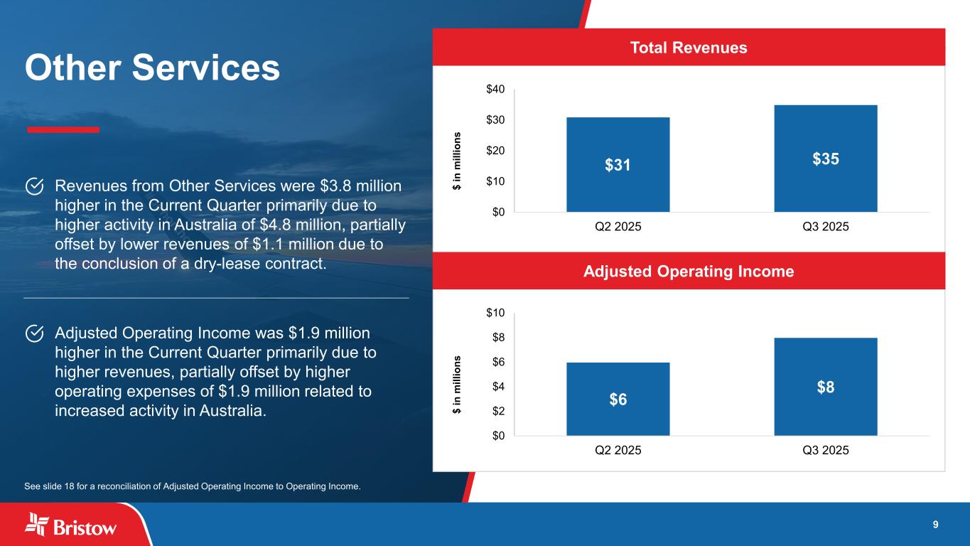 8 Government Services Total Revenues Adjusted Operating Income Revenues were $8.4 million higher in the Current Quarter primarily due to the ongoing transition of the Irish Coast Guard (“IRCG”) search and rescue contract as an additional base commenced operations in the third quarter. Adjusted Operating Income was $4.8 million higher than the Preceding Quarter primarily due to the higher revenues, partially offset by higher operating expenses of $2.8 million and higher general and administrative expenses of $0.8 million, both of which increased due to of the ongoing contract transitions. Repairs and maintenance costs were $4.0 million lower due to higher vendor credits and timing of repairs. $6 $11 $0 $4 $8 $12 Q2 2025 Q3 2025 $ in m ill io ns $93 $101 $0 $20 $40 $60 $80 $100 Q2 2025 Q3 2025 $ in m ill io ns See slide 18 for a reconciliation of Adjusted Operating Income to Operating Income.