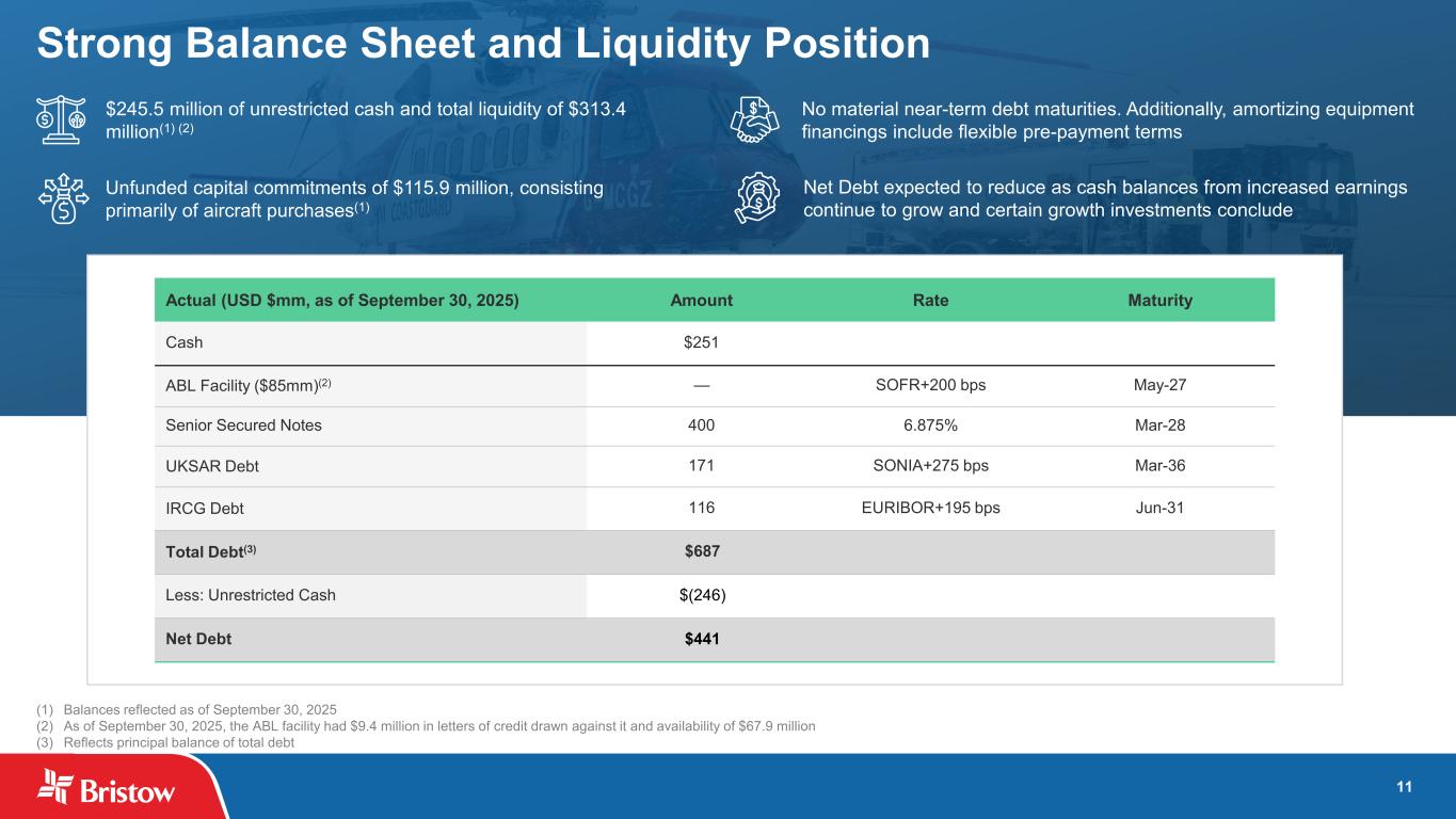 12 (Adjusted EBITDA – Maintenance CapEx – Cash Taxes) Average (Gross Debt + Book Equity) Increased Cash Flow Generation Driving Value Creation (1) Based on midpoint of Adjusted EBITDA outlook ranges. 5.6% 9.1% 12.3% 12.0% 15.8% 0.0% 2.0% 4.0% 6.0% 8.0% 10.0% 12.0% 14.0% 16.0% 2022A 2023A 2024A 2025E 2026E Bristow Cash ROIC by Year (1) (1) Cash ROIC =
