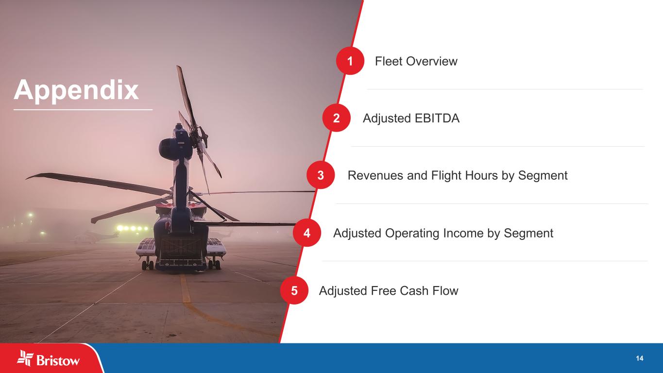13 Priority Philosophy Strategic Objectives Capital Allocation Framework Balance Sheet Growth Shareholder Capital Returns • Protect and maintain strong balance sheet and liquidity position • Structure leases and debt to facilitate financial flexibility • Pursue high impact, high return organic growth opportunities • Assess other growth opportunities: ─ Opportunistic M&A ─ Advanced Air Mobility (AAM) • Return capital to shareholders via opportunistic share buybacks and quarterly dividends • Pay down debt to a balance of approximately $500 million gross debt by the end of 2026 • Complete transitions of new IRCG and UKSAR2G contracts • Upgrade fleet with new OES configured AW189 helicopters to meet customer demand and boost profitability • Opportunistically buy back shares using $125 million share repurchase program • Initiate a quarterly dividend program beginning in Q1 2026, with an initial dividend payment of $0.125 per share ($0.50 per share annualized) A Disciplined and Focused Approach Status • $40.1 million (£29.6 million) of accelerated principal payments on UKSAR Debt facility • Completed the investment required for the new Government Services aircraft • Ongoing investment for new OES AW189 helicopters • $4.0 million of share repurchases. Currently, $121.0 million remains available under the repurchase program As of September 30, 2025