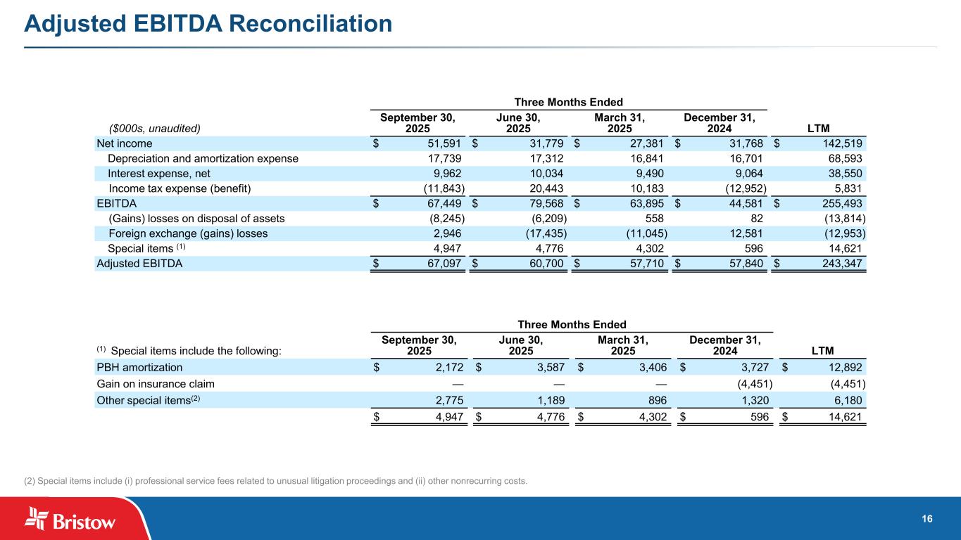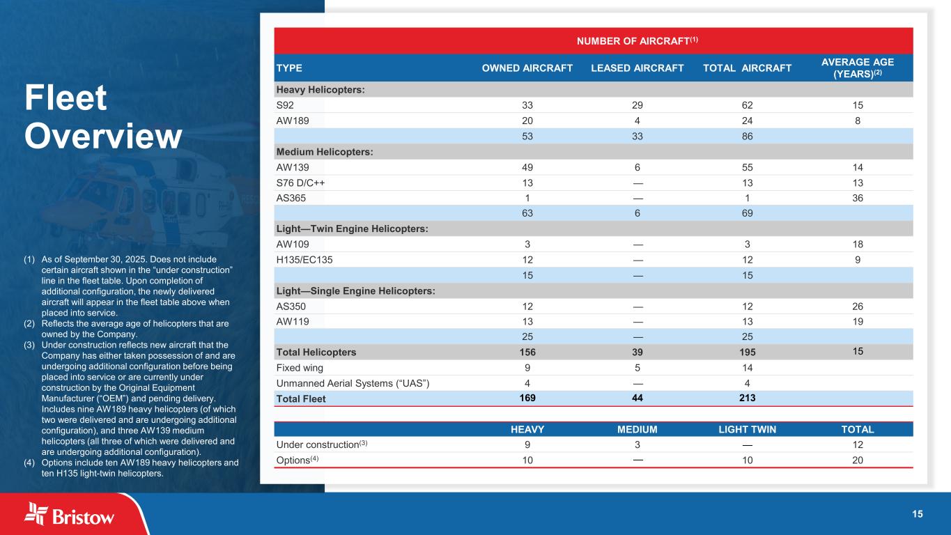 15 Fleet Overview NUMBER OF AIRCRAFT(1) TYPE OWNED AIRCRAFT LEASED AIRCRAFT TOTAL AIRCRAFT AVERAGE AGE (YEARS)(2) Heavy Helicopters: S92 33 29 62 15 AW189 20 4 24 8 53 33 86 Medium Helicopters: AW139 49 6 55 14 S76 D/C++ 13 — 13 13 AS365 1 — 1 36 63 6 69 Light—Twin Engine Helicopters: AW109 3 — 3 18 H135/EC135 12 — 12 9 15 — 15 Light—Single Engine Helicopters: AS350 12 — 12 26 AW119 13 — 13 19 25 — 25 Total Helicopters 156 39 195 15 Fixed wing 9 5 14 Unmanned Aerial Systems (“UAS”) 4 — 4 Total Fleet 169 44 213 HEAVY MEDIUM LIGHT TWIN TOTAL Under construction(3) 9 3 — 12 Options(4) 10 — 10 20 (1) As of September 30, 2025. Does not include certain aircraft shown in the “under construction” line in the fleet table. Upon completion of additional configuration, the newly delivered aircraft will appear in the fleet table above when placed into service. (2) Reflects the average age of helicopters that are owned by the Company. (3) Under construction reflects new aircraft that the Company has either taken possession of and are undergoing additional configuration before being placed into service or are currently under construction by the Original Equipment Manufacturer (“OEM”) and pending delivery. Includes nine AW189 heavy helicopters (of which two were delivered and are undergoing additional configuration), and three AW139 medium helicopters (all three of which were delivered and are undergoing additional configuration). (4) Options include ten AW189 heavy helicopters and ten H135 light-twin helicopters.