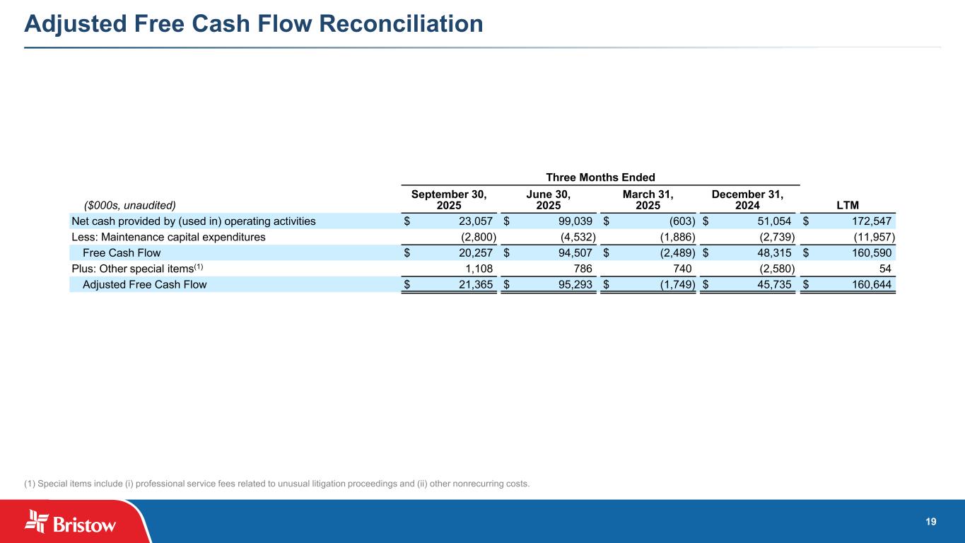 18 Adjusted Operating Income Reconciliation Three Months Ended ($000s, unaudited) September 30, 2025 June 30, 2025 Offshore Energy Services: Operating income $ 42,429 $ 43,595 Depreciation and amortization expense 7,049 6,924 PBH amortization 1,758 3,069 Offshore Energy Services Adjusted Operating Income $ 51,236 $ 53,588 Government Services: Operating income (loss) $ 2,586 $ (1,912) Depreciation and amortization expense 7,846 7,496 PBH amortization 378 452 Government Services Adjusted Operating Income $ 10,810 $ 6,036 Other Services: Operating income $ 5,463 $ 3,443 Depreciation and amortization expense 2,622 2,679 PBH amortization 36 66 Other Services Adjusted Operating Income $ 8,121 $ 6,188 Total Segments Adjusted Operating Income $ 70,167 $ 65,812 Corporate: Operating income (loss) $ 57 $ (2,486) Depreciation and amortization expense 222 213 Losses (gains) on disposal of assets (8,245) (6,209) Corporate Adjusted Operating Loss $ (7,966) $ (8,482) Consolidated Adjusted Operating Income $ 62,201 $ 57,330